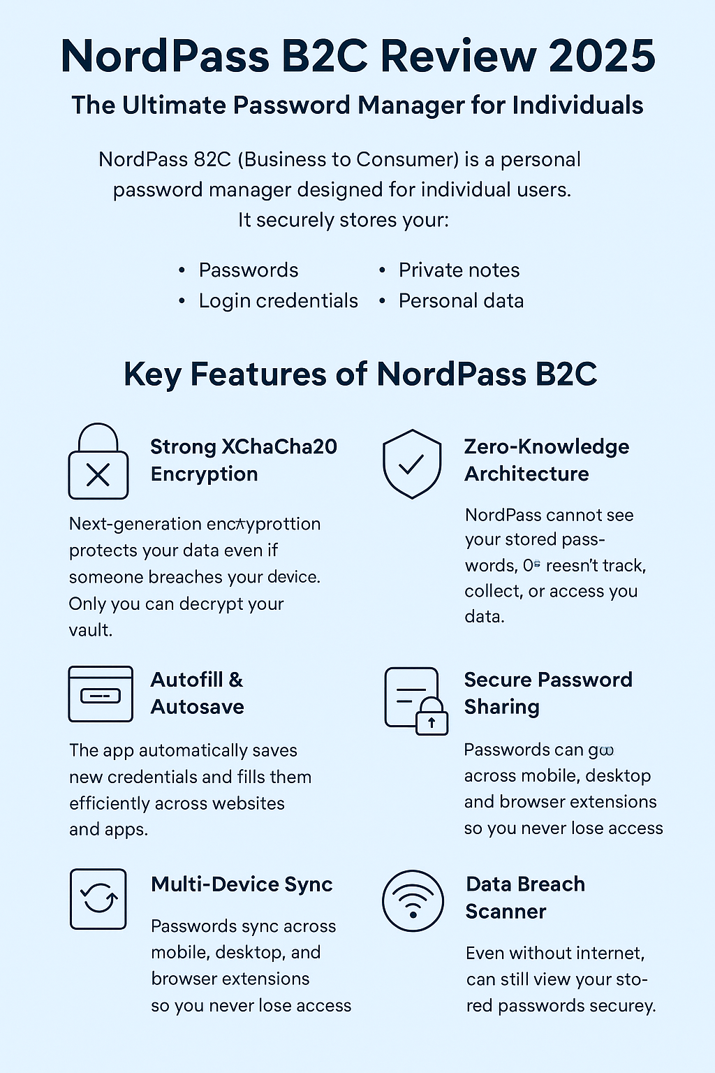 In today’s digital age, cyber-threats are increasing every single day. From social media logins to banking portals, people juggle dozens of passwords often weak, reused, or stored in unsafe places. NordPass B2C, developed by the cybersecurity team behind NordVPN, provides a secure and effortless way to manage all your passwords in one encrypted vault.